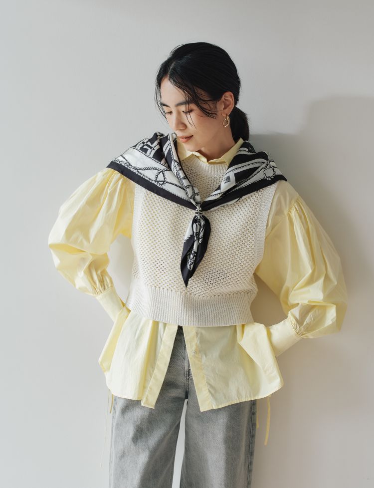 サイズは53×53cmのプチサイズ。コンパクトに巻いて頂けて、どんなスタイリングにも合わせやすいサイズ感です。首に巻いて頂くことは勿論、ヘアや手首に巻いてコーディネートのポイントとしてもお使い頂けます。