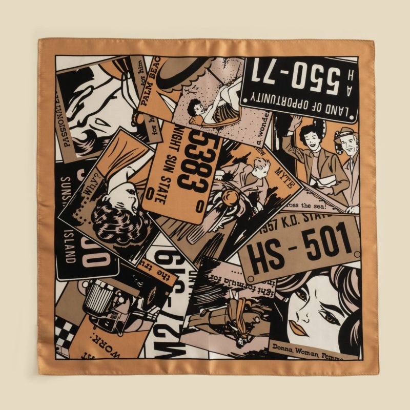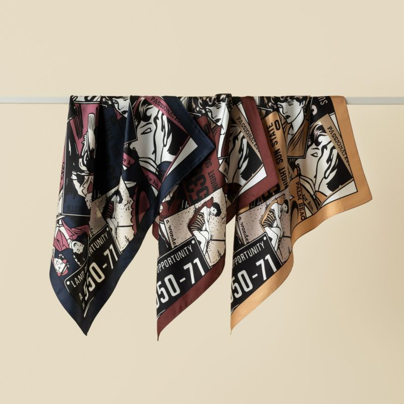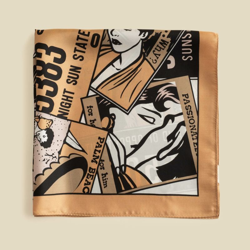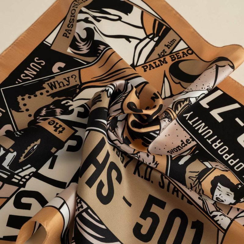 アメコミ調のイラストの入ったシルク100%スカーフです。落ち着いたトーンのカラーリングとなっておりますので、ワンポイントとしてもおススメです。