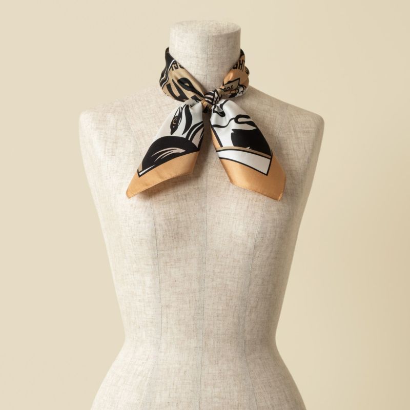 サイズは53×53cmのプチサイズ。コンパクトに巻いて頂けて、どんなスタイリングにも合わせやすいサイズです。首に巻く以外にも、手首に巻いたり、鞄に付けたりと様々なシーンで大活躍してくれます。