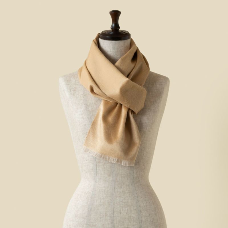 シルク100%の生地を丁寧にブラッシングし、カシミヤのようなふんわりとした質感に仕上げました。シルクだからこそ生まれる美しい光沢は、他の天然繊維や合成繊維では出すことが出来ないエレガントな印象を与えてくれます。