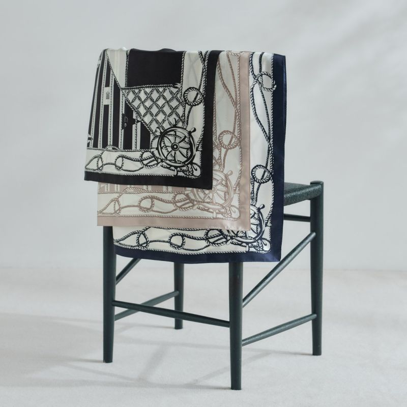 マリンスタイルをモチーフに、シックで大人の気品あふれるスカーフが新登場しました。コーディネートに馴染みやすいベーシックカラーで、モノトーンスタイルやお仕事スタイルのアクセントにも活躍する一枚です。