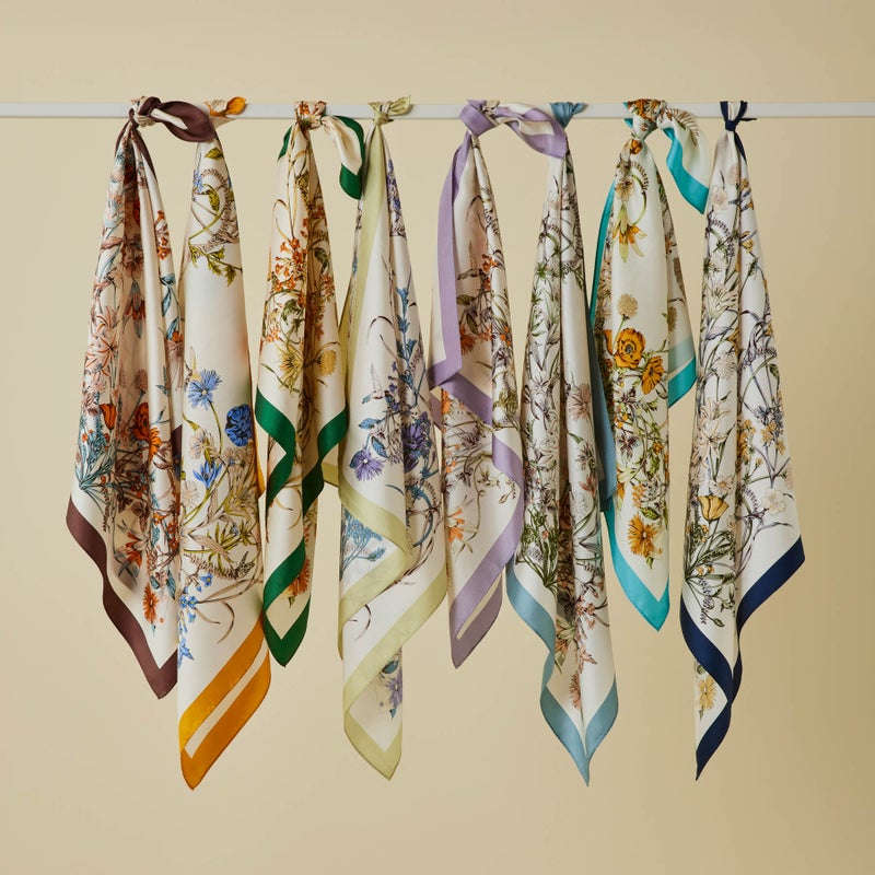 当店一番人気のボタニカルスカーフ。生命力あふれる植物が描かれており、春らしい爽やかなデザインが特徴です。