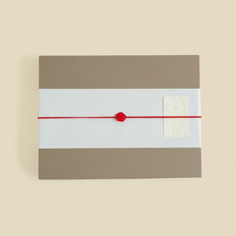 こちらの商品には『水引ゴム・祝いカード・ギフトBOX・ギフトBAG』をセットにしてお包み致します。『水引ゴム』オプションより、ご希望の水引ゴムの色をお選びください。
