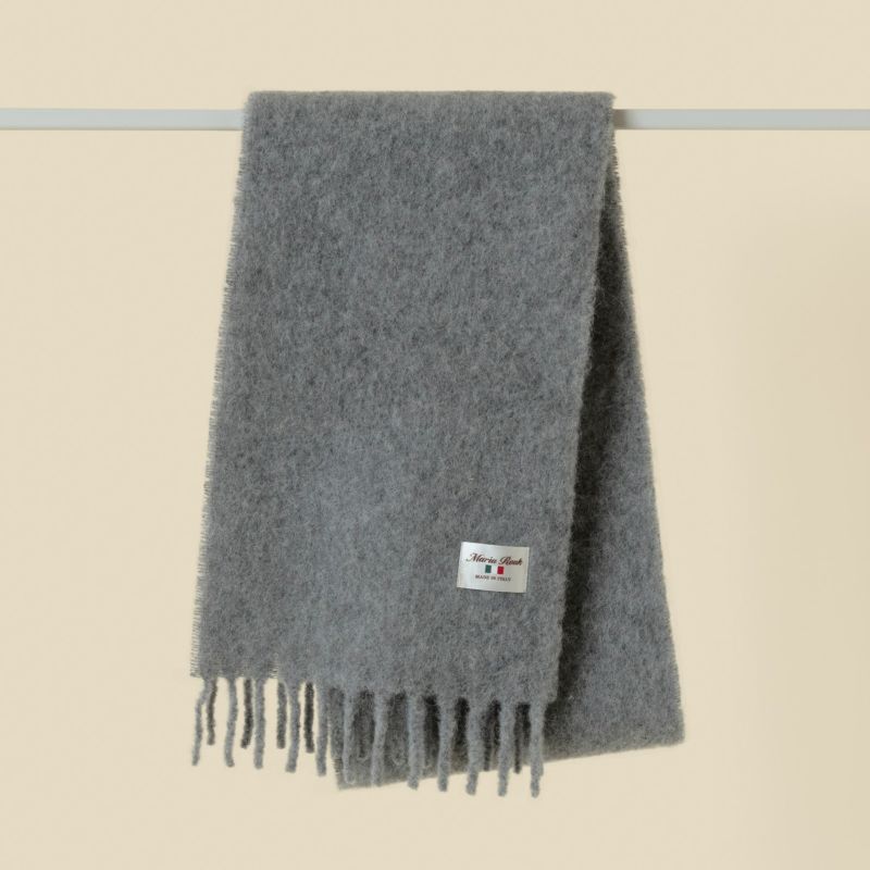 Maria Roukの協力工場でイタリア製の上質な糸を使い、じっくり丁寧に織り上げたブークレマフラーです。アルパカ繊維とウールの高い保湿性、耐久性に優れたナイロンをブレンドした糸を使用しておりますので、マフラーは軽量でありながら柔軟性と保温性に優れています。