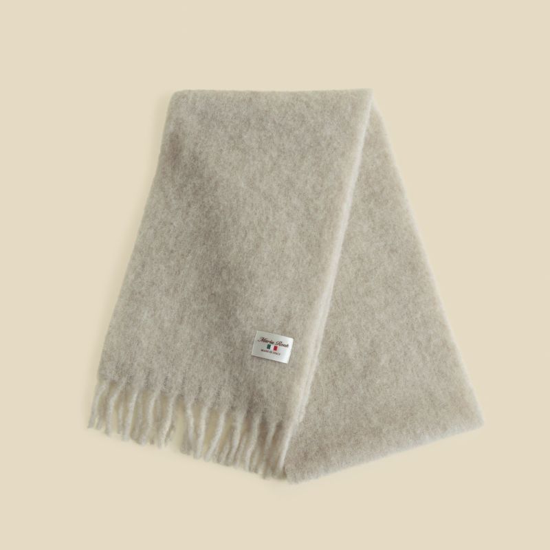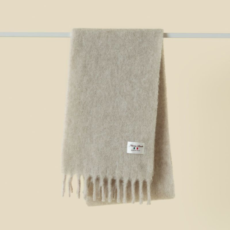 Maria Roukの協力工場でイタリア製の上質な糸を使い、じっくり丁寧に織り上げたブークレマフラーです。アルパカ繊維とウールの高い保湿性、耐久性に優れたナイロンをブレンドした糸を使用しておりますので、マフラーは軽量でありながら柔軟性と保温性に優れています。