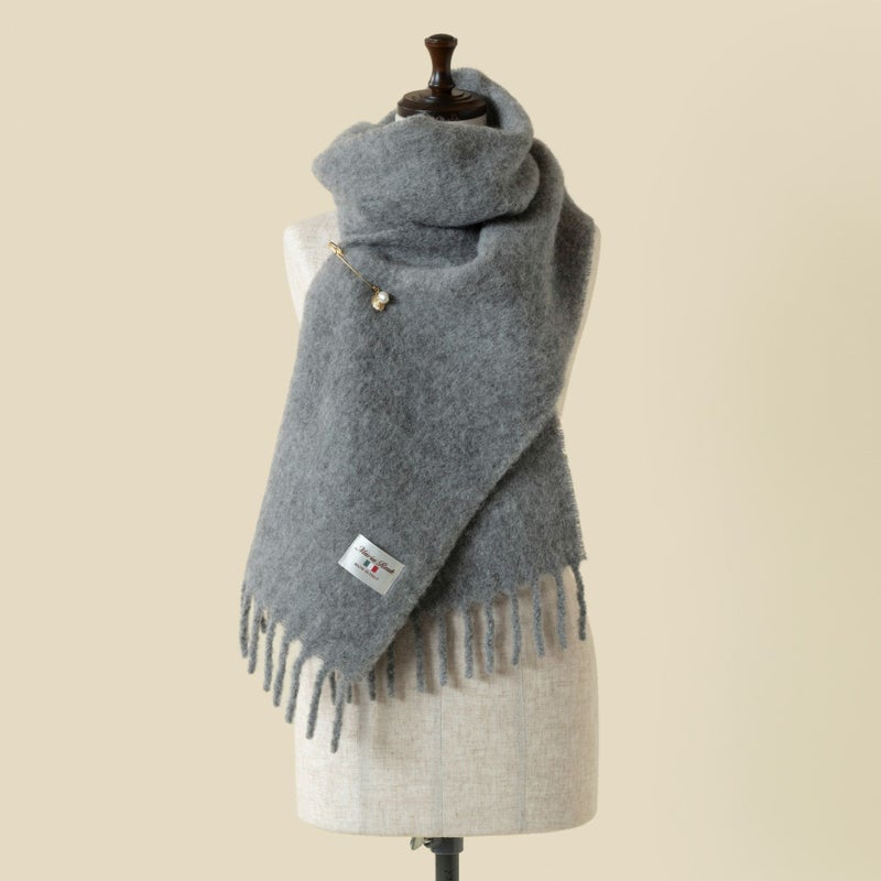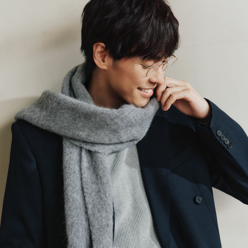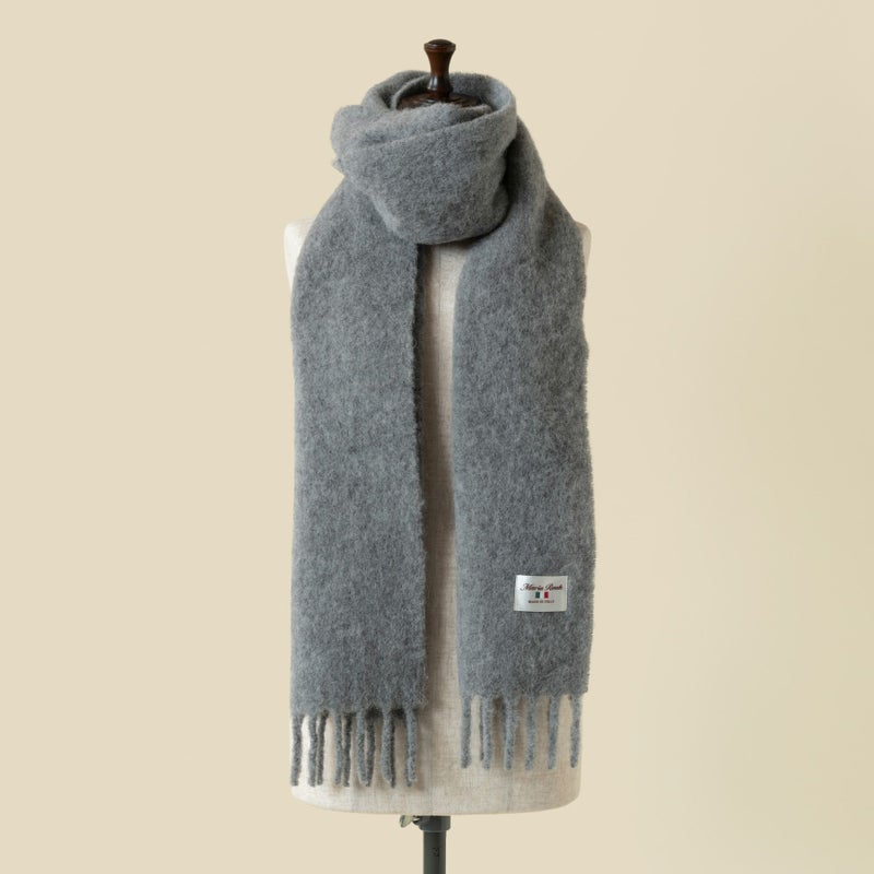Maria Roukの協力工場でイタリア製の上質な糸を使い、じっくり丁寧に織り上げたブークレマフラーです。アルパカ繊維とウールの高い保湿性、耐久性に優れたナイロンをブレンドした糸を使用しておりますので、マフラーは軽量でありながら柔軟性と保温性に優れています。