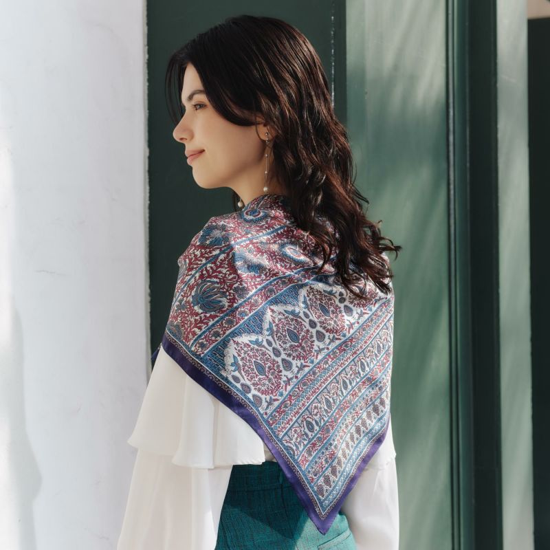 ヴィンテージの雰囲気を演出してくれるレトロ柄のシルク100%スカーフです。多彩な色合いで繊細にプリントされた柄がとても綺麗なスカーフです。伝統ある日本の工場で、職人が丁寧に手捺染で染め上げております。生地は上質なシルクツイルを使用。シルク100%特有の美しい光沢感、滑らかな極上の肌触りでコーディネートを華やかにしてくれます。サイズは定番の90cm×90cm。首に巻く以外にも、頭に巻いたり、ベルトのように腰に巻いたりと様々なシーンで大活躍してくれます。シルク100%のスカーフは、肌触りが柔らかく、非常に軽量でありながらも保温性に優れており、一年中快適にご使用いただけます。さらにシルクは優れた吸湿性と通気性を持っており、暑い季節には体温を調整し、汗を素早く吸収して快適な状態を保つ一方、寒い季節には体温を保ちながら湿気を放出し、暖かさを保つ事が可能です。さらに天然繊維の為、お肌にやさしく、敏感肌の方やアレルギー体質の方にもおすすめです。※お客様のパソコン機器やスマートフォン及びモニタ環境の違い、または屋内・屋外での撮影により実際の商品の色と相違する場合がございます。