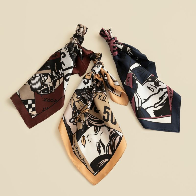 アメコミ調のイラストの入ったシルク100%スカーフです。落ち着いたトーンのカラーリングとなっておりますので、ワンポイントとしてもおススメです。
