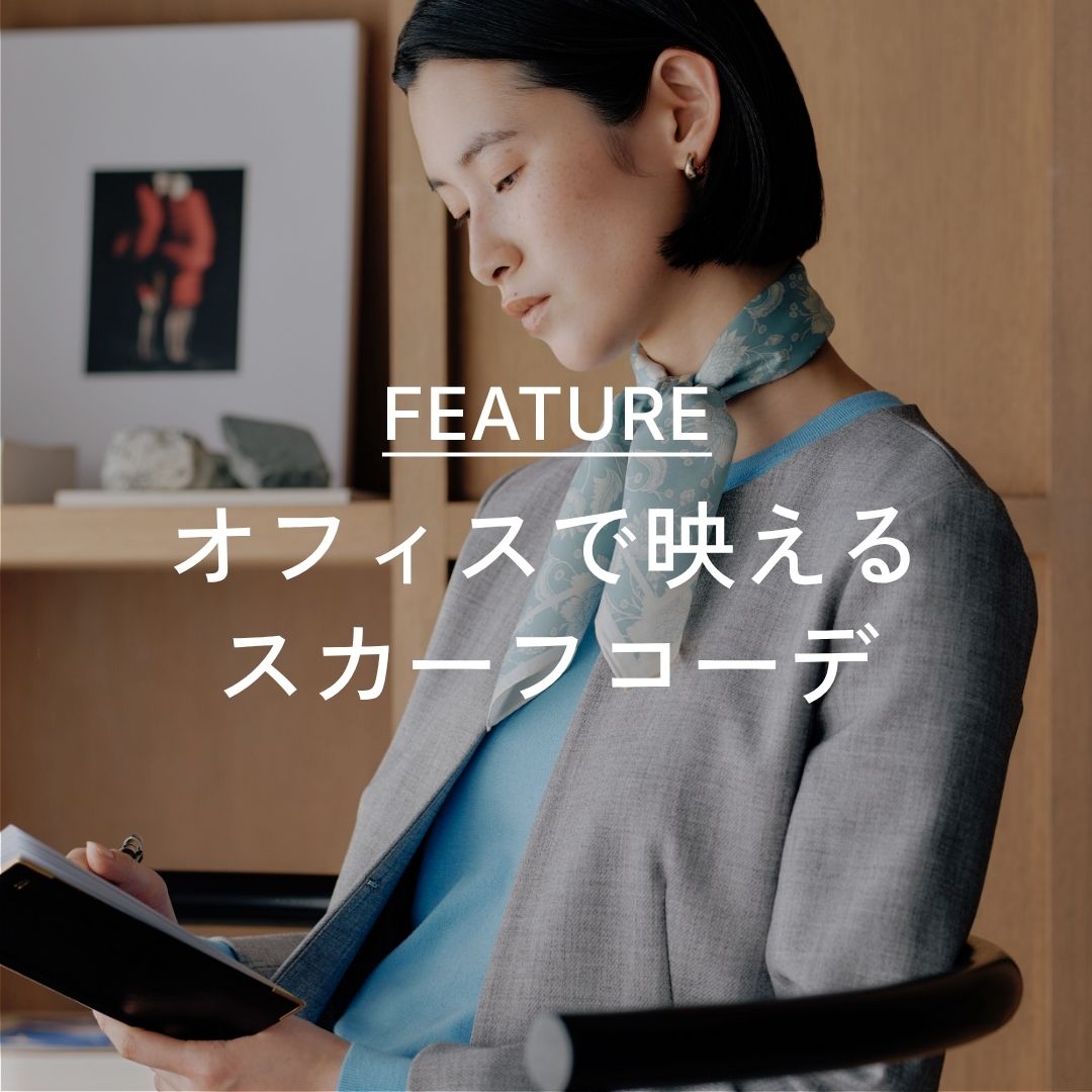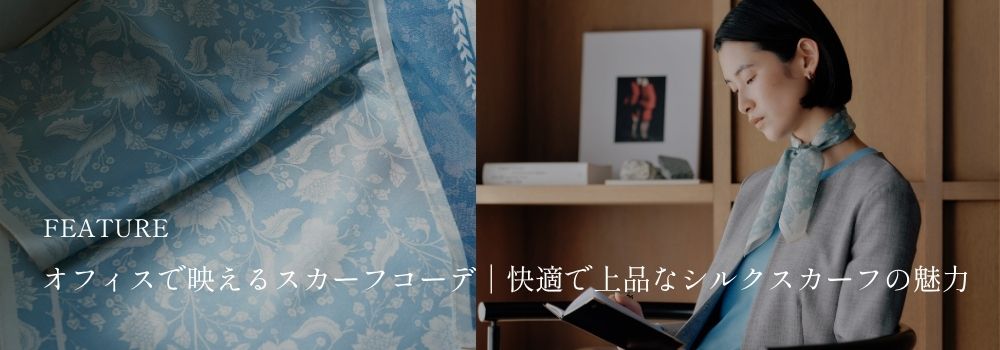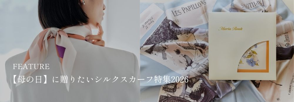 サイズは53×53cmのプチサイズ。コンパクトに巻いて頂けて、どんなスタイリングにも合わせやすいサイズです。首に巻く以外にも、手首に巻いたり、鞄に付けたりと様々なシーンで大活躍してくれます。シルク100%のスカーフは、肌触りが柔らかく、非常に軽量でありながらも保温性に優れており、一年中快適にご使用いただけます。さらにシルクは優れた吸湿性と通気性を持っており、暑い季節には体温を調整し、汗を素早く吸収して快適な状態を保つ一方、寒い季節には体温を保ちながら湿気を放出し、暖かさを保つ事が可能です。さらに天然繊維の為、お肌にやさしく、敏感肌の方やアレルギー体質の方にもおすすめです。