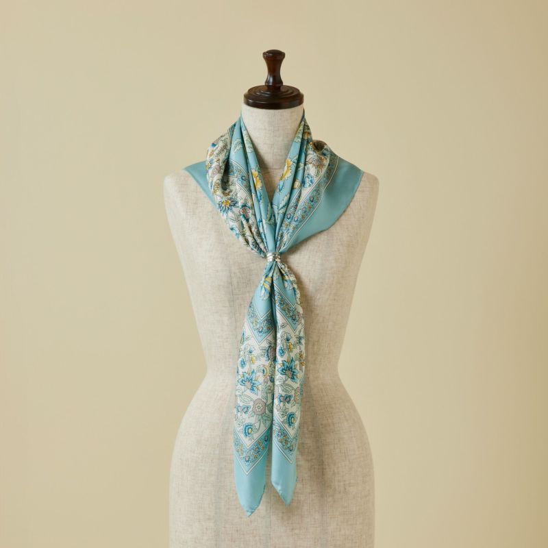 【会員登録】で300ptプレゼント★ オリエンタルフラワースカーフ<ブルー> シルク100% 日本製