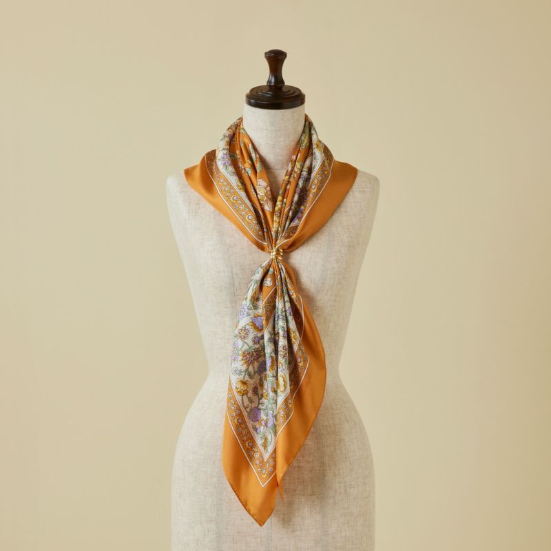 【会員登録】で300ptプレゼント★ オリエンタルフラワースカーフ<オレンジ> シルク100% 日本製
