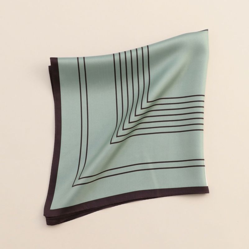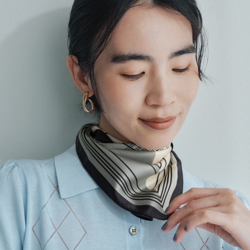 サイズは53×53cmのプチサイズ。コンパクトに巻いて頂けて、どんなスタイリングにも合わせやすいサイズです。首に巻く以外にも、手首に巻いたり、鞄に付けたりと様々なシーンで大活躍してくれます。シルク100%のスカーフは、肌触りが柔らかく、非常に軽量でありながらも保温性に優れており、一年中快適にご使用いただけます。さらにシルクは優れた吸湿性と通気性を持っており、暑い季節には体温を調整し、汗を素早く吸収して快適な状態を保つ一方、寒い季節には体温を保ちながら湿気を放出し、暖かさを保つ事が可能です。さらに天然繊維の為、お肌にやさしく、敏感肌の方やアレルギー体質の方にもおすすめです。