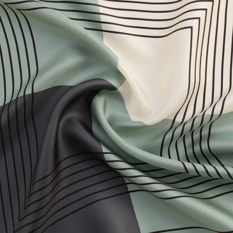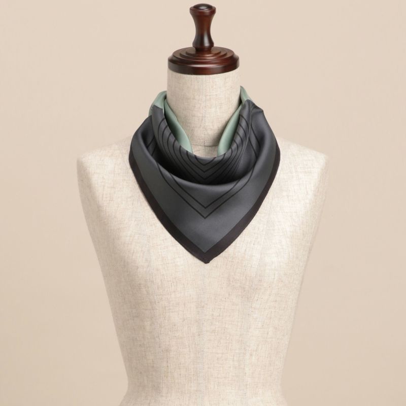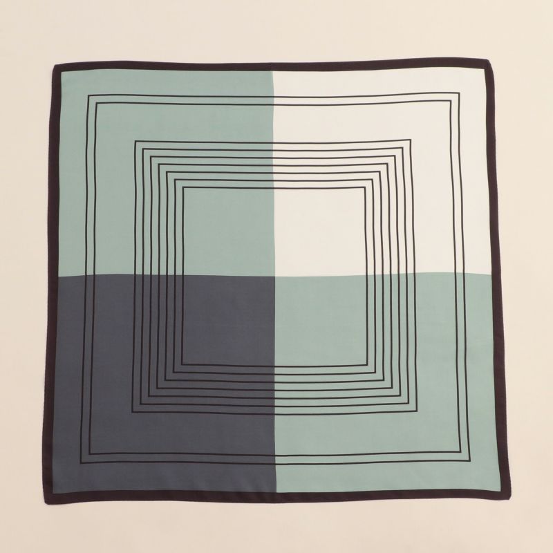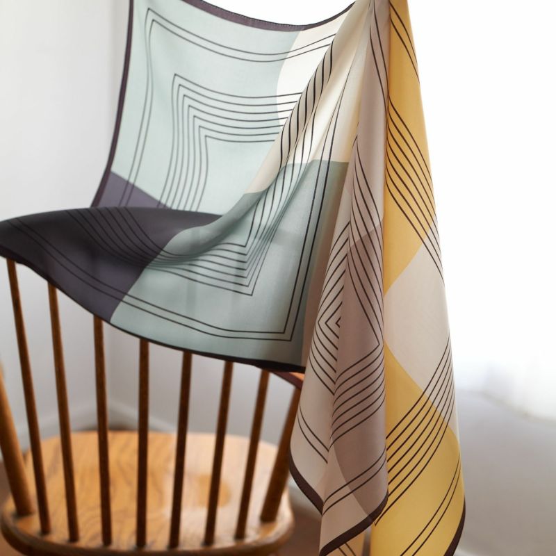 4面で配色を切り替えたジオメトリック柄のシルク100%スカーフです。巻き方によって、色の見え方が変化し、その日のスタイリングに合わせてご使用いただけます。伝統ある日本の工場で、職人が丁寧に手捺染で染め上げており、生地は上質なシルクツイルを使用。シルク100%特有の美しい光沢感、滑らかな極上の肌触りでコーディネートを華やかにしてくれるアイテムです。