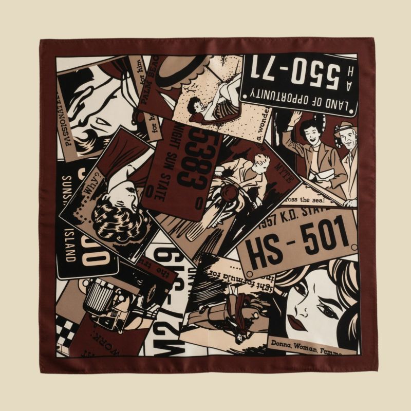 アメコミ調のイラストの入ったシルク100%スカーフです。落ち着いたトーンのカラーリングとなっておりますので、ワンポイントとしてもおススメです。