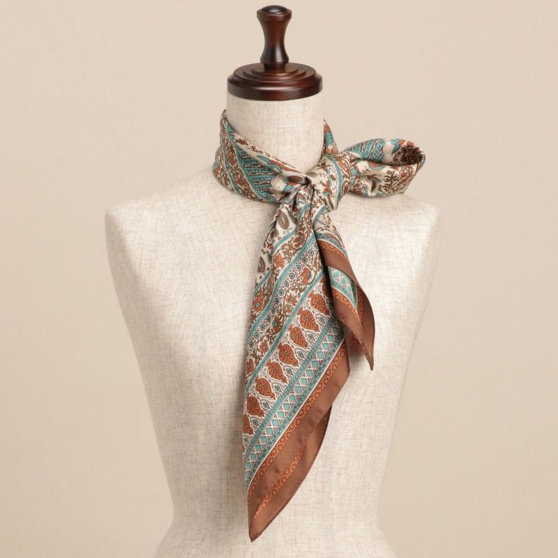 ヴィンテージの雰囲気を演出してくれるレトロ柄のシルク100%スカーフです。多彩な色合いで繊細にプリントされた柄がとても綺麗なスカーフです。伝統ある日本の工場で、職人が丁寧に手捺染で染め上げております。生地は上質なシルクツイルを使用。シルク100%特有の美しい光沢感、滑らかな極上の肌触りでコーディネートを華やかにしてくれます。サイズは定番の90cm×90cm。首に巻く以外にも、頭に巻いたり、ベルトのように腰に巻いたりと様々なシーンで大活躍してくれます。シルク100%のスカーフは、肌触りが柔らかく、非常に軽量でありながらも保温性に優れており、一年中快適にご使用いただけます。さらにシルクは優れた吸湿性と通気性を持っており、暑い季節には体温を調整し、汗を素早く吸収して快適な状態を保つ一方、寒い季節には体温を保ちながら湿気を放出し、暖かさを保つ事が可能です。さらに天然繊維の為、お肌にやさしく、敏感肌の方やアレルギー体質の方にもおすすめです。※お客様のパソコン機器やスマートフォン及びモニタ環境の違い、または屋内・屋外での撮影により実際の商品の色と相違する場合がございます。