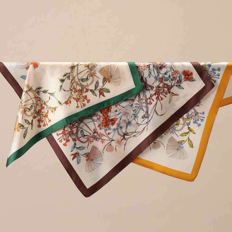 当店一番人気のボタニカルスカーフ。生命力あふれる植物が描かれており、春らしい爽やかなデザインが特徴です。