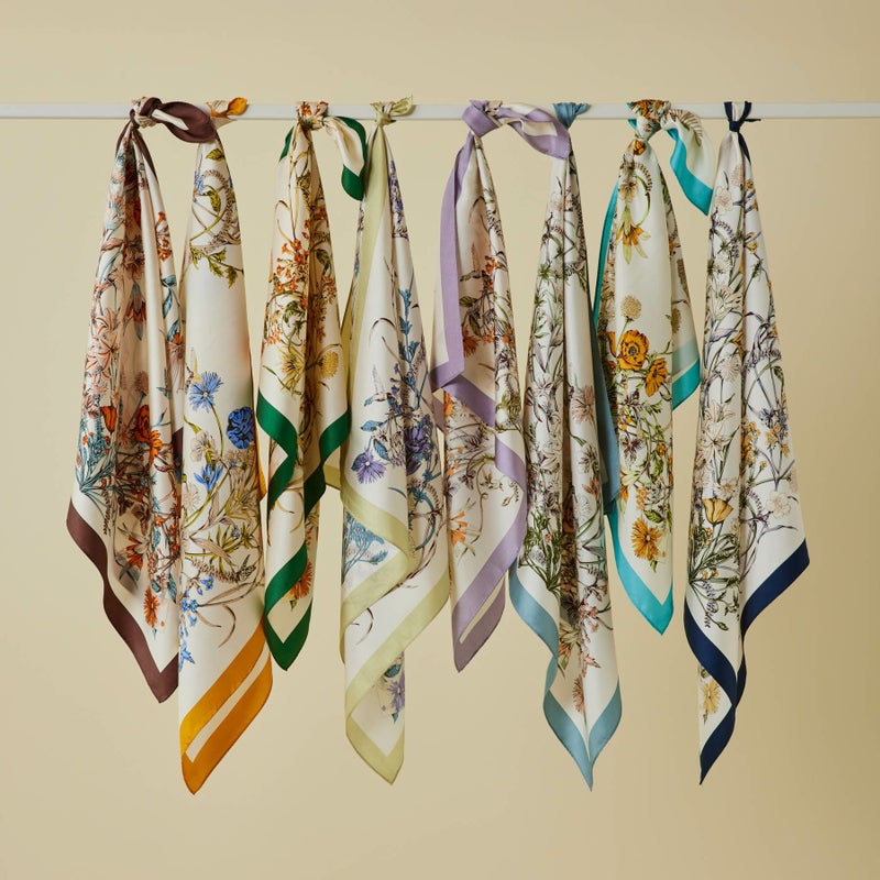 サイズは53×53cmのプチサイズ。コンパクトに巻いて頂けて、どんなスタイリングにも合わせやすいサイズ感です。首に巻いて頂くことは勿論、ヘアや手首に巻いてコーディネートのポイントとしてもお使い頂けます。お手持ちのバッグに巻く事で、華やかなバッグへイメージチェンジしてお楽しみ頂けます。