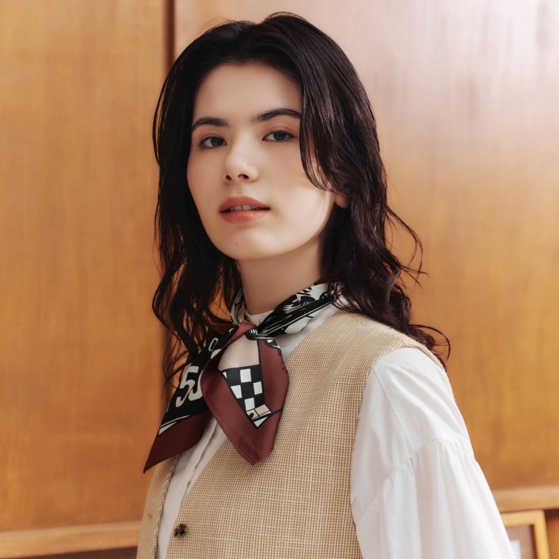 サイズは53×53cmのプチサイズ。コンパクトに巻いて頂けて、どんなスタイリングにも合わせやすいサイズです。首に巻く以外にも、手首に巻いたり、鞄に付けたりと様々なシーンで大活躍してくれます。