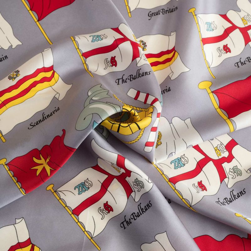鮮やかな色彩と洗練されたデザインが織りなす、まさに世界中の美を纏ったシルクスカーフが登場しました。各国の誇りを象徴する国旗モチーフが、あなたのスタイルに独自のアクセントを加えます。伝統ある日本の工場で、職人が丁寧に手捺染で染め上げております。
