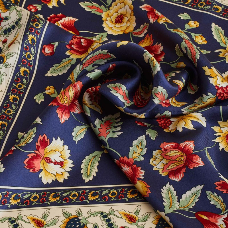 熟練の職人により、日本の『手捺染(てなっせん)』と呼ばれる伝統技法を用いてお作りしています。一般的なプリント加工とは異なり、一色ごとに型を作り染める事で柄をクリアに表現できるのが特徴です。生地は滑らかな肌触りが特徴の上質なシルクツイルを使用しております。