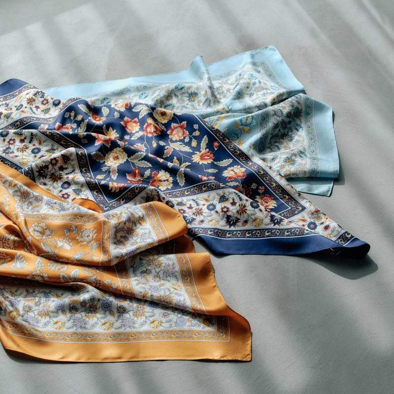 大判サイズのスカーフは、アレンジの幅が広く、首元で巻く事はもちろん、ヘアーアレンジやバックやベルトに巻き付けるなど、様々なコーディネートをお楽しみ頂けます。シルクならではの美しい光沢感が、コーディネートに華やかさをプラスしてくれます。