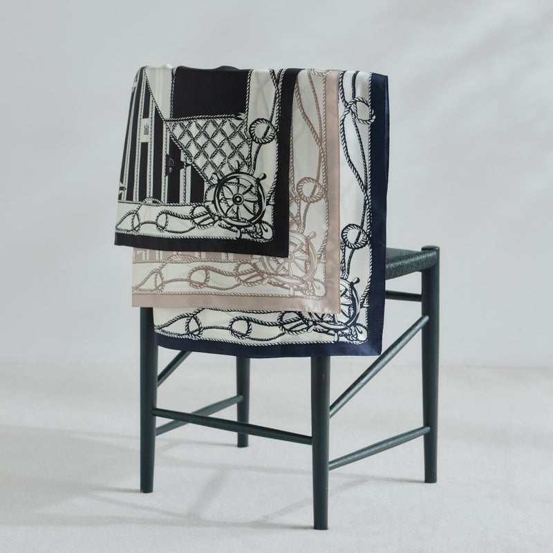 マリンスタイルをモチーフに、シックで大人の気品あふれるスカーフが新登場しました。コーディネートに馴染みやすいベーシックカラーで、モノトーンスタイルやお仕事スタイルのアクセントにも活躍する一枚です。 大判サイズのスカーフは、アレンジの幅が広く、首元で巻く事はもちろん、ヘアーアレンジやバックやベルトに巻き付けるなど、様々なコーディネートをお楽しみ頂けます。シルクならではの美しい光沢感が、コーディネートに華やかさをプラスしてくれます。熟練の職人により、日本の『手捺染(てなっせん)』と呼ばれる伝統技法を用いてお作りしています。一般的なプリント加工とは異なり、一色ごとに型を作り染める事で柄をクリアに表現できるのが特徴です。生地は滑らかな肌触りが特徴の上質なシルクツイルを使用しております。