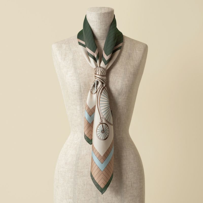 アンティークな自転車のイラストをクラシックな配色で仕上げたスカーフです。伝統ある日本の工場で、職人が丁寧に手捺染で染め上げております。