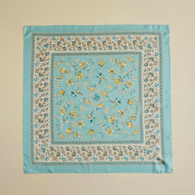 【会員登録】で300ptプレゼント★ オリエンタルフラワースカーフ<ブルー> シルク100% 日本製