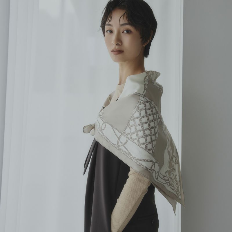 マリンスタイルをモチーフに、シックで大人の気品あふれるスカーフが新登場しました。コーディネートに馴染みやすいベーシックカラーで、モノトーンスタイルやお仕事スタイルのアクセントにも活躍する一枚です。 大判サイズのスカーフは、アレンジの幅が広く、首元で巻く事はもちろん、ヘアーアレンジやバックやベルトに巻き付けるなど、様々なコーディネートをお楽しみ頂けます。シルクならではの美しい光沢感が、コーディネートに華やかさをプラスしてくれます。熟練の職人により、日本の『手捺染(てなっせん)』と呼ばれる伝統技法を用いてお作りしています。一般的なプリント加工とは異なり、一色ごとに型を作り染める事で柄をクリアに表現できるのが特徴です。生地は滑らかな肌触りが特徴の上質なシルクツイルを使用しております。