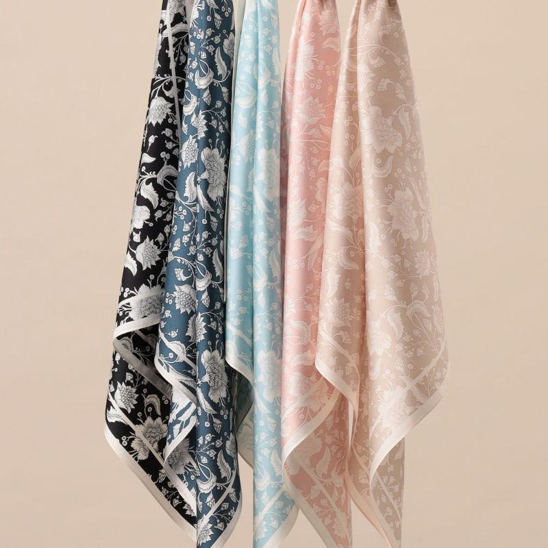 サイズは53×53cmのプチサイズ。コンパクトに巻いて頂けて、どんなスタイリングにも合わせやすいサイズです。首に巻く以外にも、手首に巻いたり、鞄に付けたりと様々なシーンで大活躍してくれます。シルク100%のスカーフは、肌触りが柔らかく、非常に軽量でありながらも保温性に優れており、一年中快適にご使用いただけます。さらにシルクは優れた吸湿性と通気性を持っており、暑い季節には体温を調整し、汗を素早く吸収して快適な状態を保つ一方、寒い季節には体温を保ちながら湿気を放出し、暖かさを保つ事が可能です。さらに天然繊維の為、お肌にやさしく、敏感肌の方やアレルギー体質の方にもおすすめです。