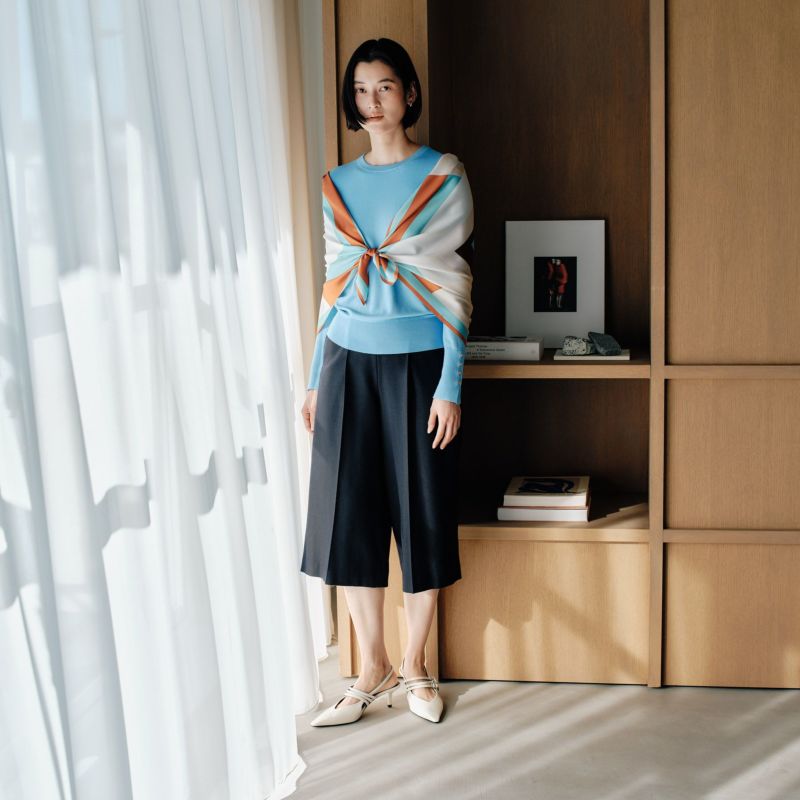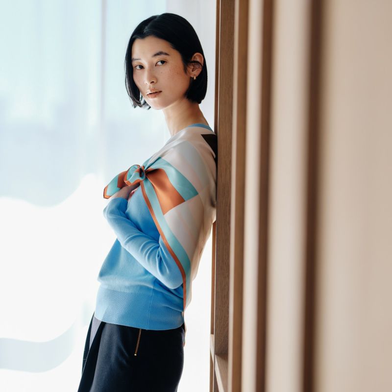 レトロな雰囲気を演出してくれるジオメトリック柄のシルク100%スカーフです。巻き方によって見え方が変化し、様々な表情を楽しんでいただけます。伝統ある日本の工場で、職人が丁寧に手捺染で染め上げたシルクスカーフです。生地は上質なシルクツイルを使用。シルク100%特有の美しい光沢感、滑らかな極上の肌触りでコーディネートを華やかにしてくれるアイテムです。