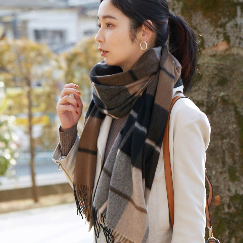 60cm幅と程よいサイズ感となりますので、巻き方次第で華やかに見える冬のスタイリングに便利な1枚であり、ユニセックスでお使いいただけるアイテム。落ち着いた柄色の為、ビジネス用・ギフト用としとしてもおすすめの商品です。