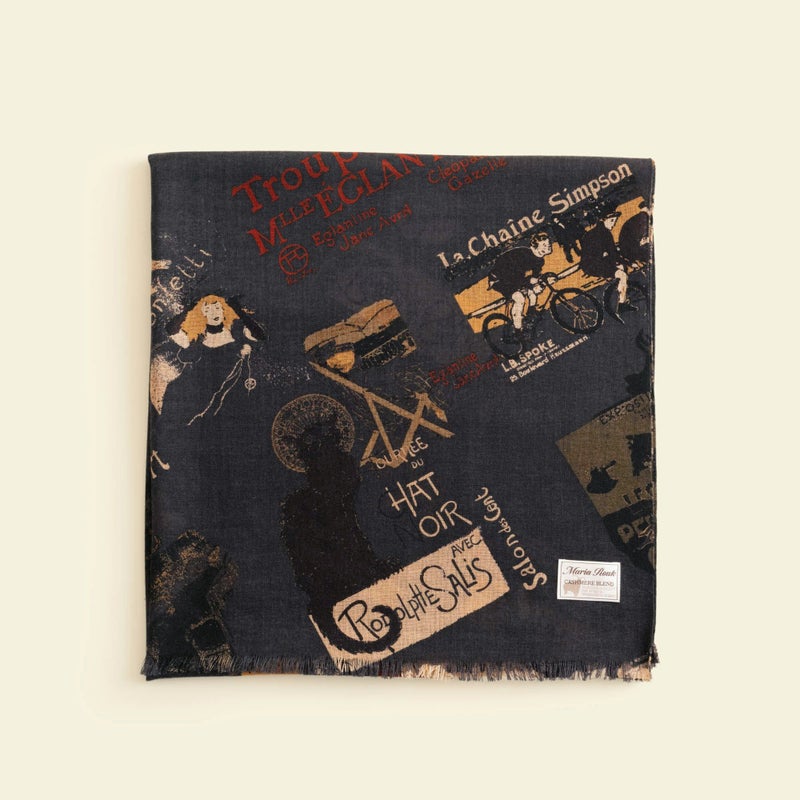 フランスの有名な画家ロートレックの絵をアレンジして作られた日本製のストール。Maria Roukのシルクスカーフ作成に使用される捺染技術を応用し、同じ技法でプリントしております。内モンゴル自治区で採れるウールとカシミヤをブレンドした天然繊維生地を使用しておりますので、暖かさを保ちながらも通気性を備えており、快適にご着用いただけます。折りたたむとコンパクトになりますので、旅行や日常の持ち運びにも便利です。季節を問わず使える素材感により、オフィスや映画館の冷房対策にも役立ちます。落ち着いた配色のストールは、コーディネートにも馴染みやすく、お洒落のアクセントとしてもご活用いただけます。また、ご自宅で手洗いが可能なので、お手入れも簡単です。