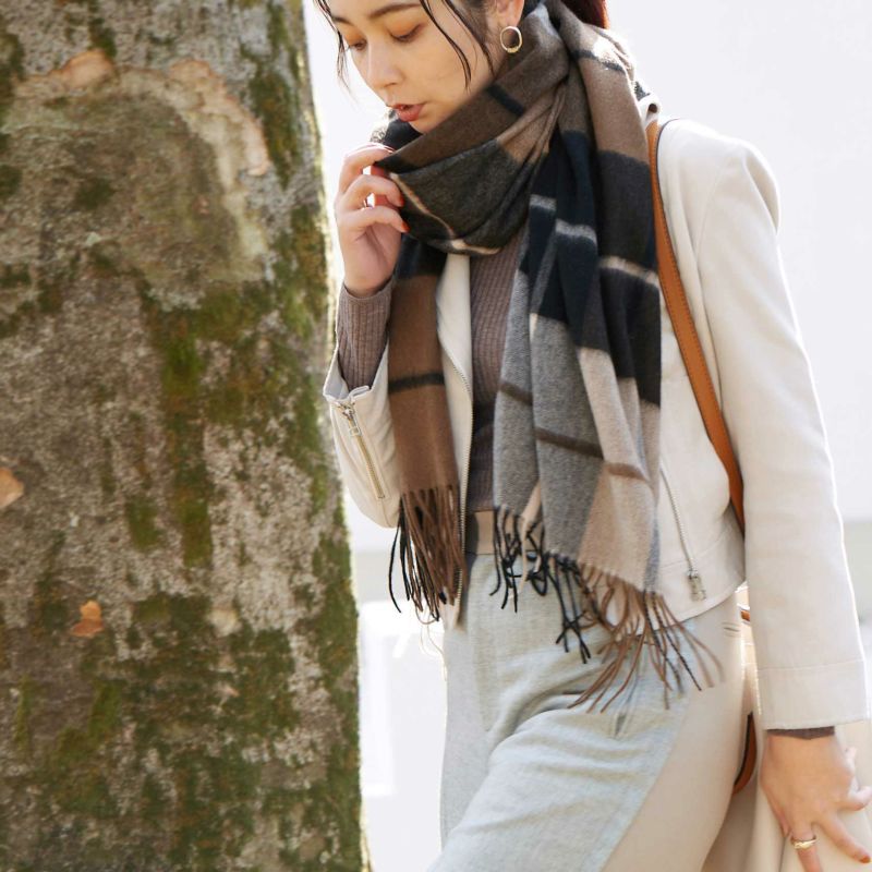 60cm幅と程よいサイズ感となりますので、巻き方次第で華やかに見える冬のスタイリングに便利な1枚であり、ユニセックスでお使いいただけるアイテム。落ち着いた柄色の為、ビジネス用・ギフト用としとしてもおすすめの商品です。