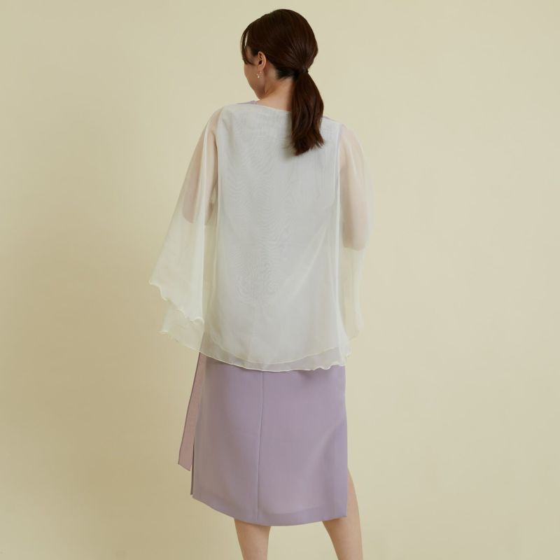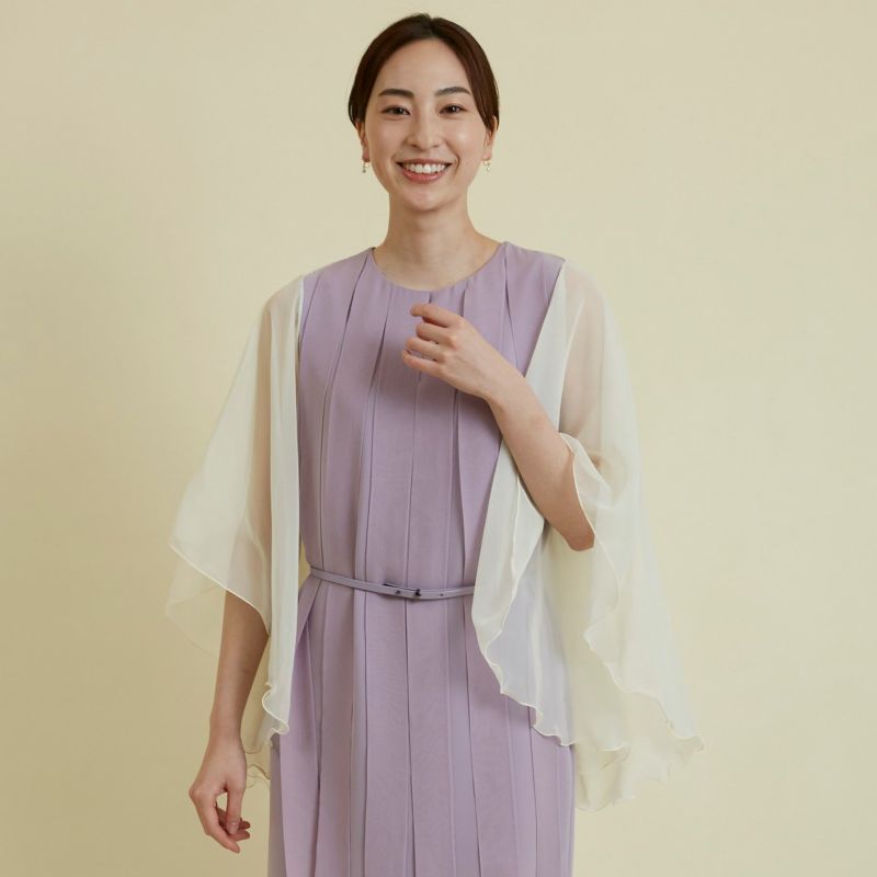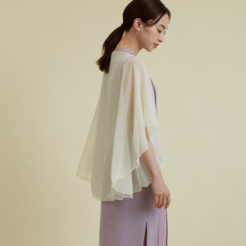 透け感が美しいシアーケープ。ドレスの肌見せを抑えたい時や、いつものワンピースをレイヤードスタイルで楽しみたい時などに、オススメなアイテムです。上半身に華やかさをプラスしながら、程よい透け感で、重たく見えないの特徴です。結婚式や食事会など様々なシーンでご利用頂けます。 上下同じデザインとなっておりますので、タグが下向きになるようご着用下さい。 ※お客様のパソコン機器やスマートフォン及びモニタ環境の違い、または屋内・屋外での撮影により実際の商品の色と相違する場合がございます。