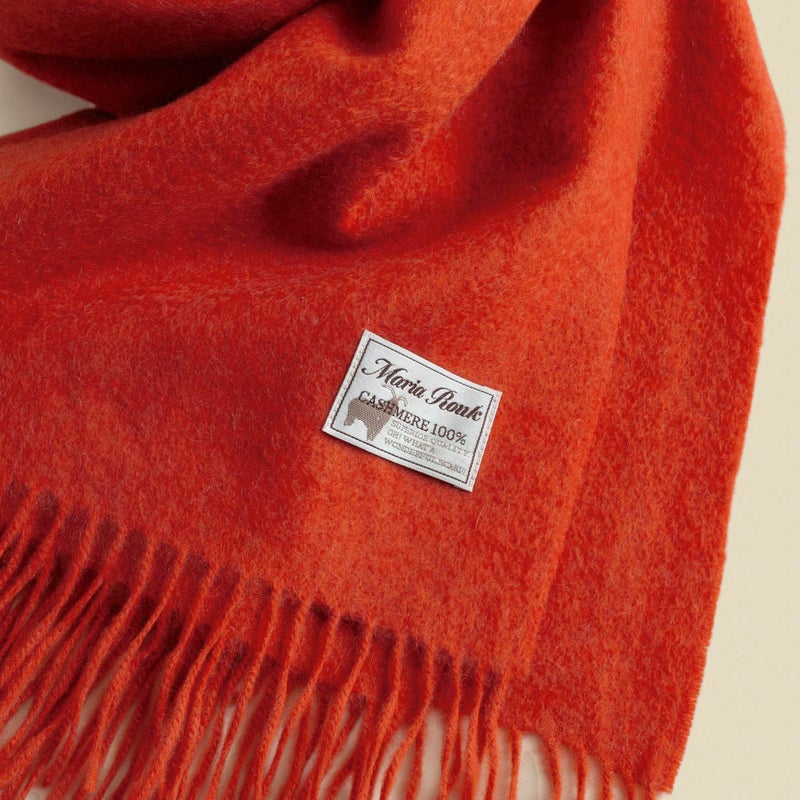 他の方のレビュー通り落ち着いた感じの朱赤のストールです。色違いのグリーンは複数色の混織でしたがレッドは単色のように見えます。繊維が均一で上品な光沢もあり綺麗です。屋内、屋外、時間帯、季節によって色の見え方に違いはあると思いますが様々なシーンで朱赤のトーンの変化を楽しませてくれます。毛羽の付着も気にならず軽くて使い心地の良いストールです。