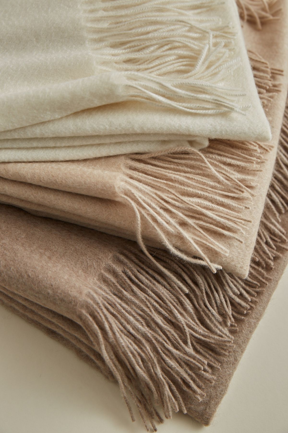 無染色というところと自然な優しい色味に惹かれ、前回購入のオフホワイトに続きベージュを購入いたしました。実際の色味が画像の色味と近いのか少し不安でしたが、手元に届いた商品の色は想像した通りの色味で安心しました。優しい滑らかな手触りはカシミヤ100%ならでは。このクオリティーでこのお値段ならば色違い、サイズ違いで複数枚購入できてとってもうれしいですね。
