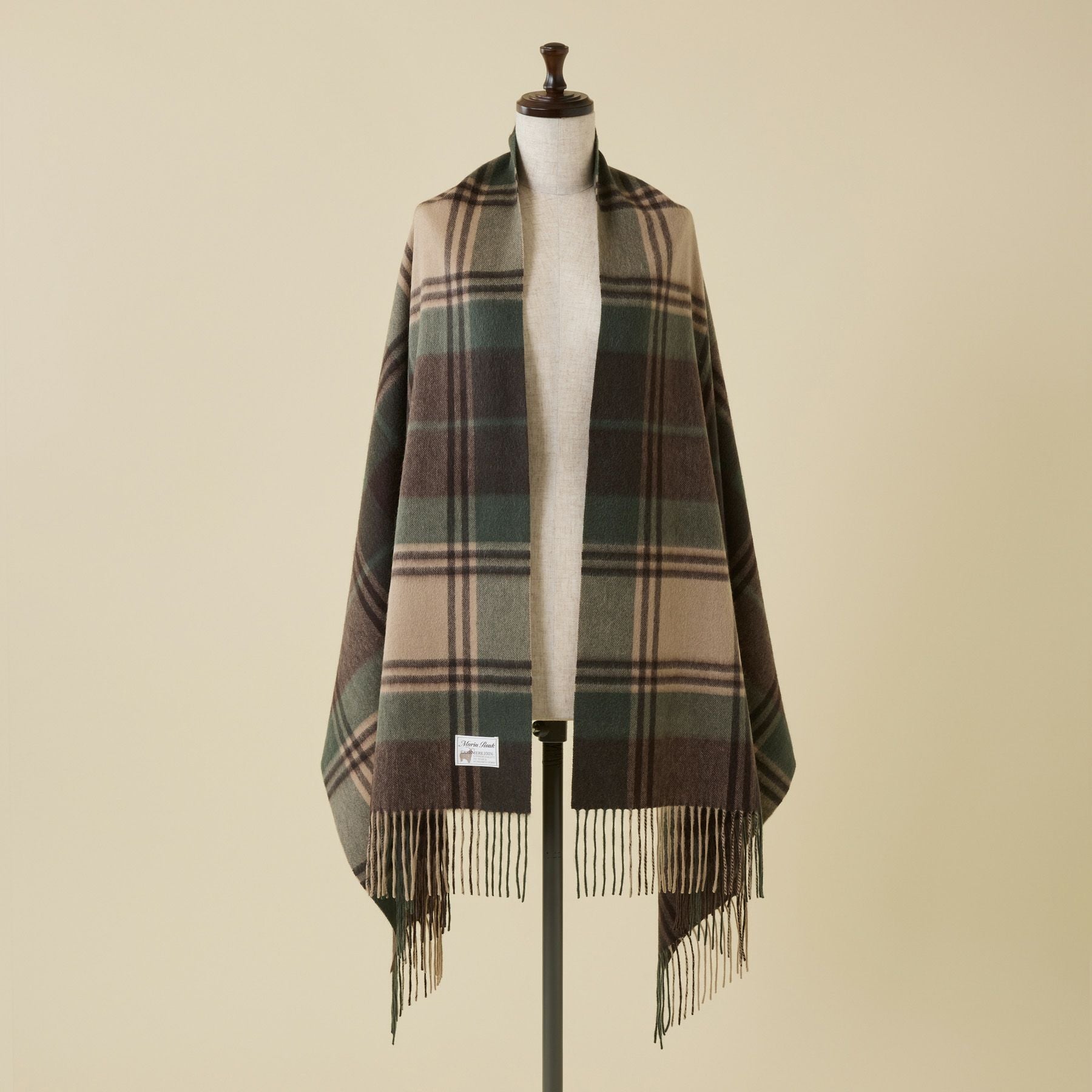 カシミヤ100%大判チェックストール<カーキ>